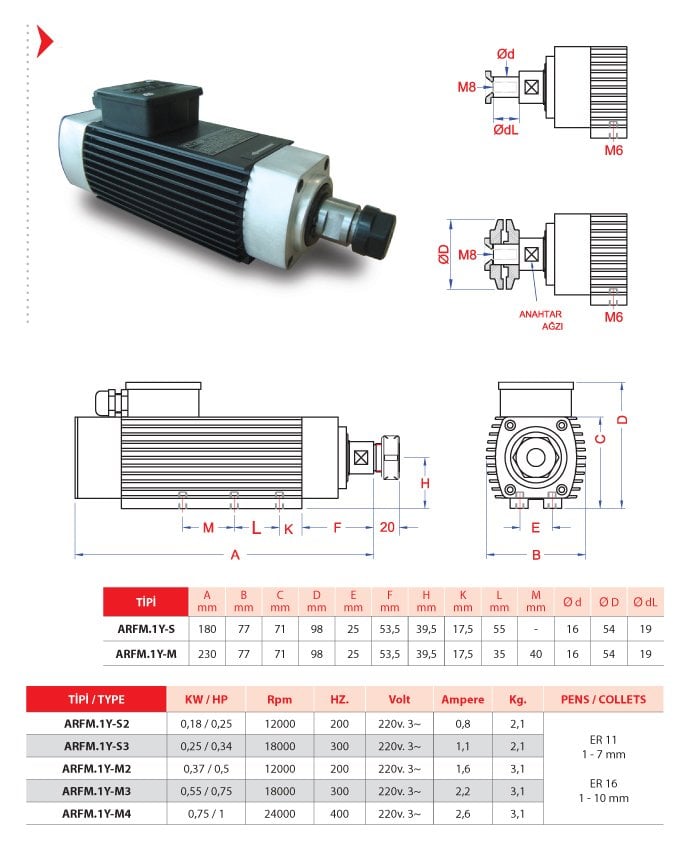 Arel spindle motorlar 0,55 kw gücünde 300 hertzde 18000 devir ile spindle dönmektedir.Er16 mil standardı ile 1-10 mm çaplarında takımlar ile işleme yapabilirsiniz.