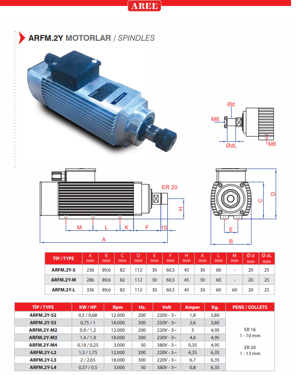 Arel spindle motorlar 1,4 kw gücünde 300 hertzde 18000 devir ile spindle dönmektedir.Er20 mil standardı ile 1-13 mm çaplarında takımlar ile işleme yapabilirsiniz.