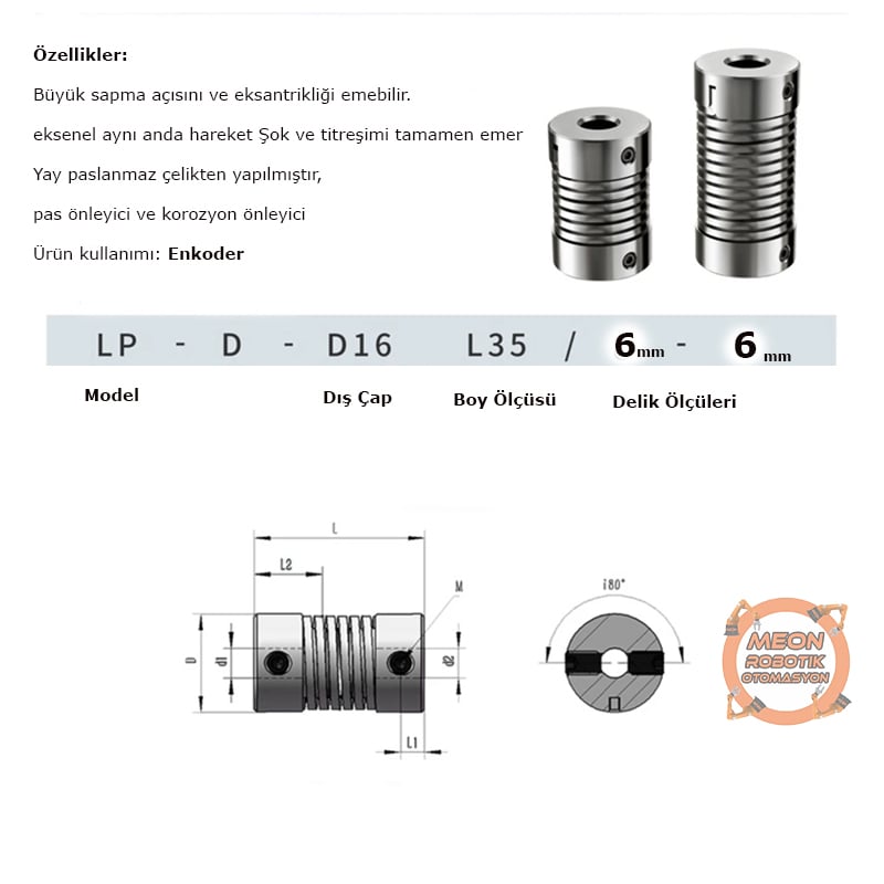 Çelik yaylı enkoder kaplinler, Meon Robotik Otomasyon mağazamızda satışta olan ürünler arasında yer alır. Bu kaplinler, meon robotik otomasyonda hassas hareket aktarımı için rotary enkoderler ile miller arasında kullanılan önemli bir bileşendir. Yüksek tork aktarımı ve uzun ömür vadeden çelik başlık ve yay kısmıyla donatılmıştır. Bu kaplinler, enkoderlerin veri iletiminde kritik bir rol oynar.