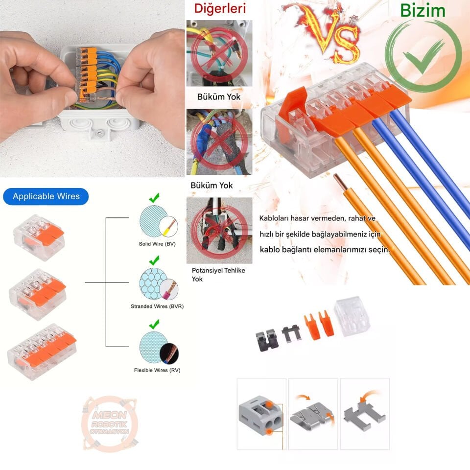 Bu set, WAGO tarzı tırnaklı klemens sistemlerinin sunduğu hız ve güvenliği ekonomik bir paketle birleştirir. Farklı pin sayıları sayesinde tek bir set ile birçok projede çözüm sunar. Özellikle seri montajlarda zaman kazandırır ve profesyonel sonuç elde etmenizi sağlar.