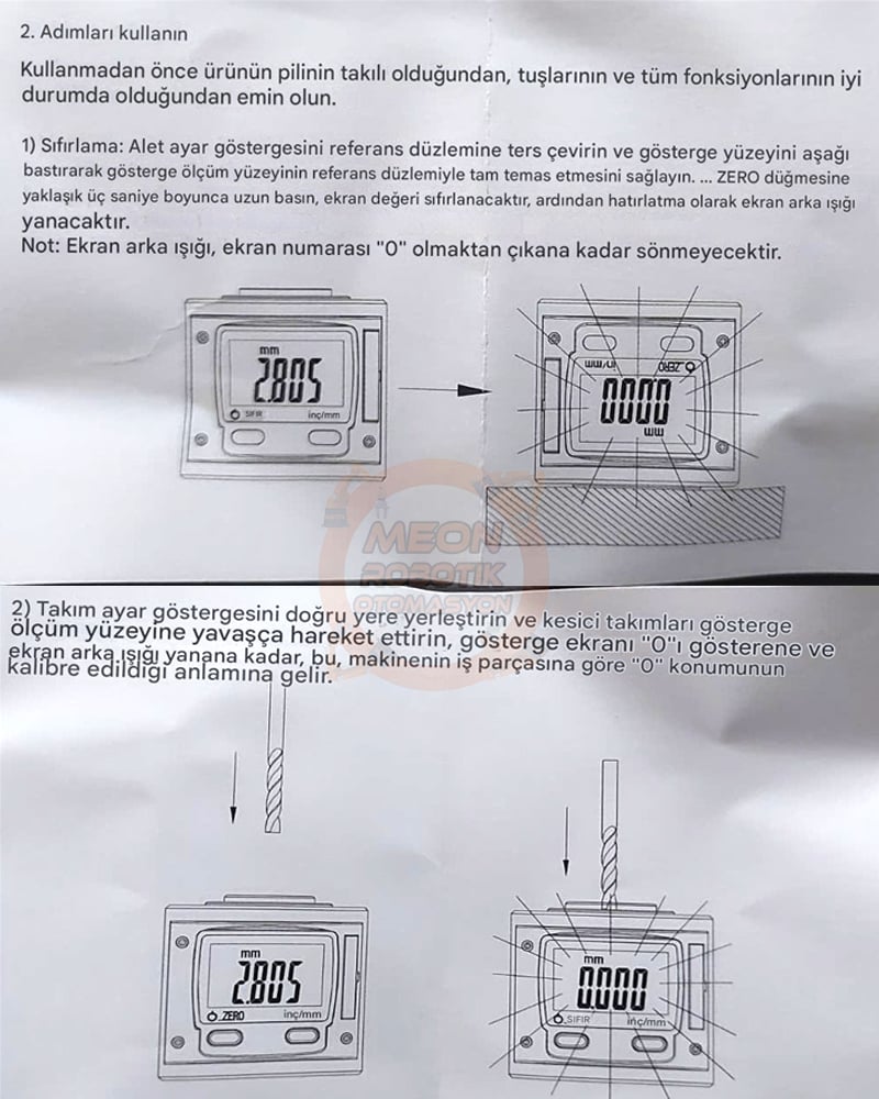 Kesici ucu cihazın ölçüm yüzeyine yaklaştırın; LED ışığı yandığında “0” konumu ayarlanmış olur.