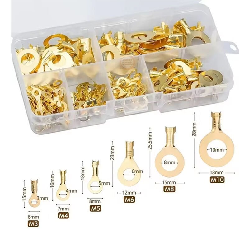 Yüksek iletkenliğe sahip pirinç (brass) malzemeden üretilen bu terminaller, oksitlenmeye karşı dirençli altın rengi kaplamasıyla uzun ömürlü kullanım sağlar. M3'ten M10'a kadar en sık kullanılan ölçüleri içeren bu set, özel organizer kutusu sayesinde karışıklığı önler ve taşıma kolaylığı sunar.