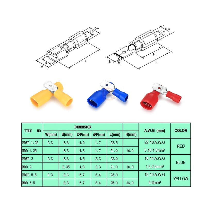 İzoleli Faston Dişi – Erkek Kablo Ucu Seti | 200 Parça – Kırmızı Mavi Sarı – 3 Boy Crimp Terminal